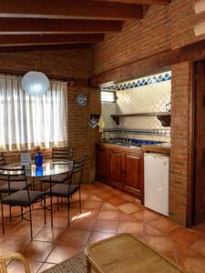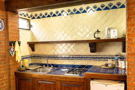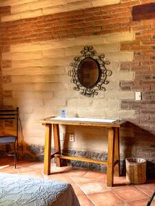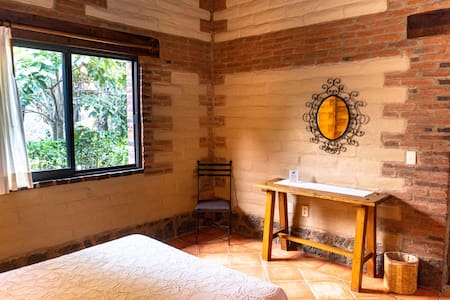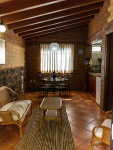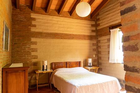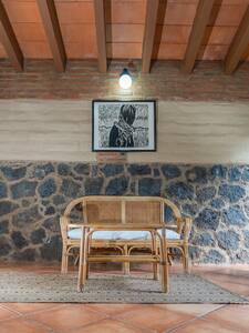 Our cozy cabin features a double bed, a dining table, a well-equipped kitchenette, and a full bathroom with a shower. The private patio, furnished with comfortable chairs, is perfect for enjoying your morning coffee or evening stargazing. Built with adobe and brick, the cabin combines traditional architecture with sustainable practices, integrating feng shui principles for a balanced flow of energy. Native plants and animals are abundant around the property, adding to the natural charm.