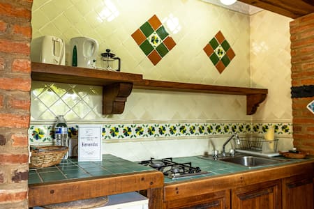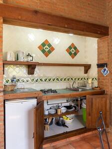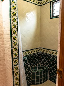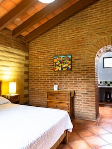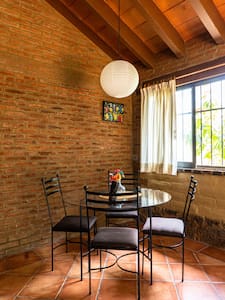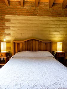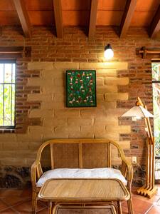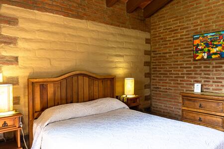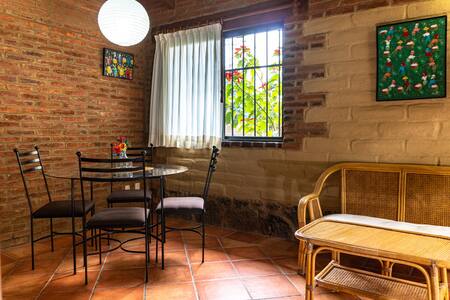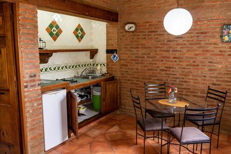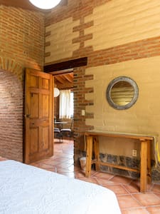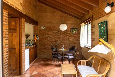Our cozy cabin features a double bed, a dining table, a well-equipped kitchenette, and a full bathroom with a shower. The private patio, furnished with comfortable chairs, is perfect for enjoying your morning coffee or evening stargazing. Built with adobe and brick, the cabin combines traditional architecture with sustainable practices, integrating feng shui principles for a balanced flow of energy. Native plants and animals are abundant around the property, adding to the natural charm.