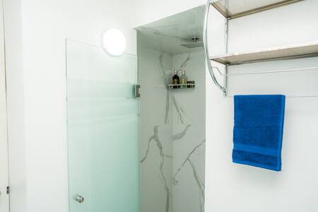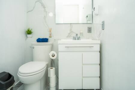 The modern bathroom is fully equipped with all the essentials you need, including fresh towels, toiletries, and a spacious shower. It's the perfect spot to refresh and recharge.