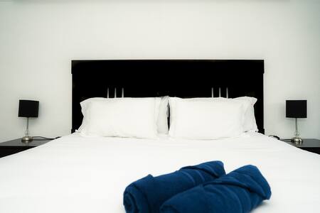 The apartment features two beautifully appointed bedrooms. The master bedroom boasts a luxurious king-size bed, providing a restful retreat. The second bedroom includes a comfortable double bed, ideal for additional guests, children, or friends traveling together.