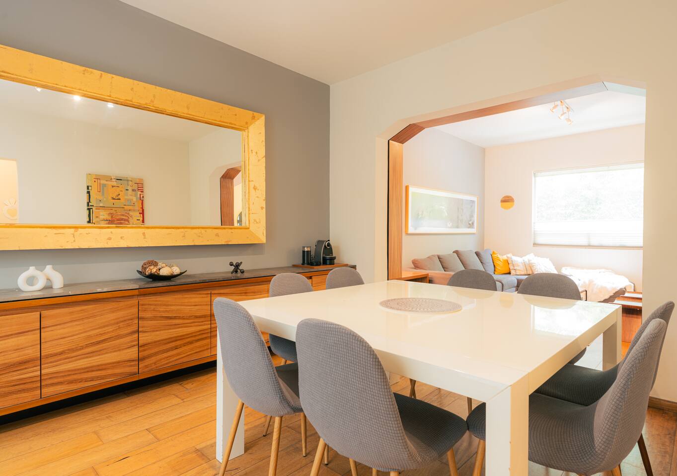 Step into a cozy living room ideal for relaxing after a day of exploring, a stylish dining area perfect for shared meals, and a fully equipped kitchen stocked with all the essentials for cooking at home. A small private deck adds the perfect morning ritual spot for coffee or a quiet break.