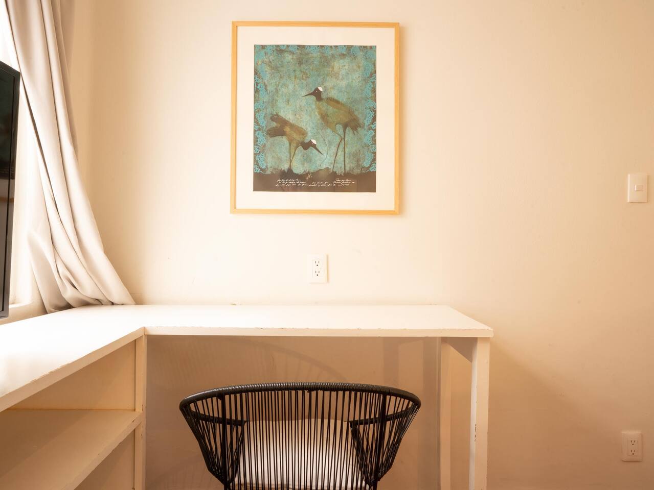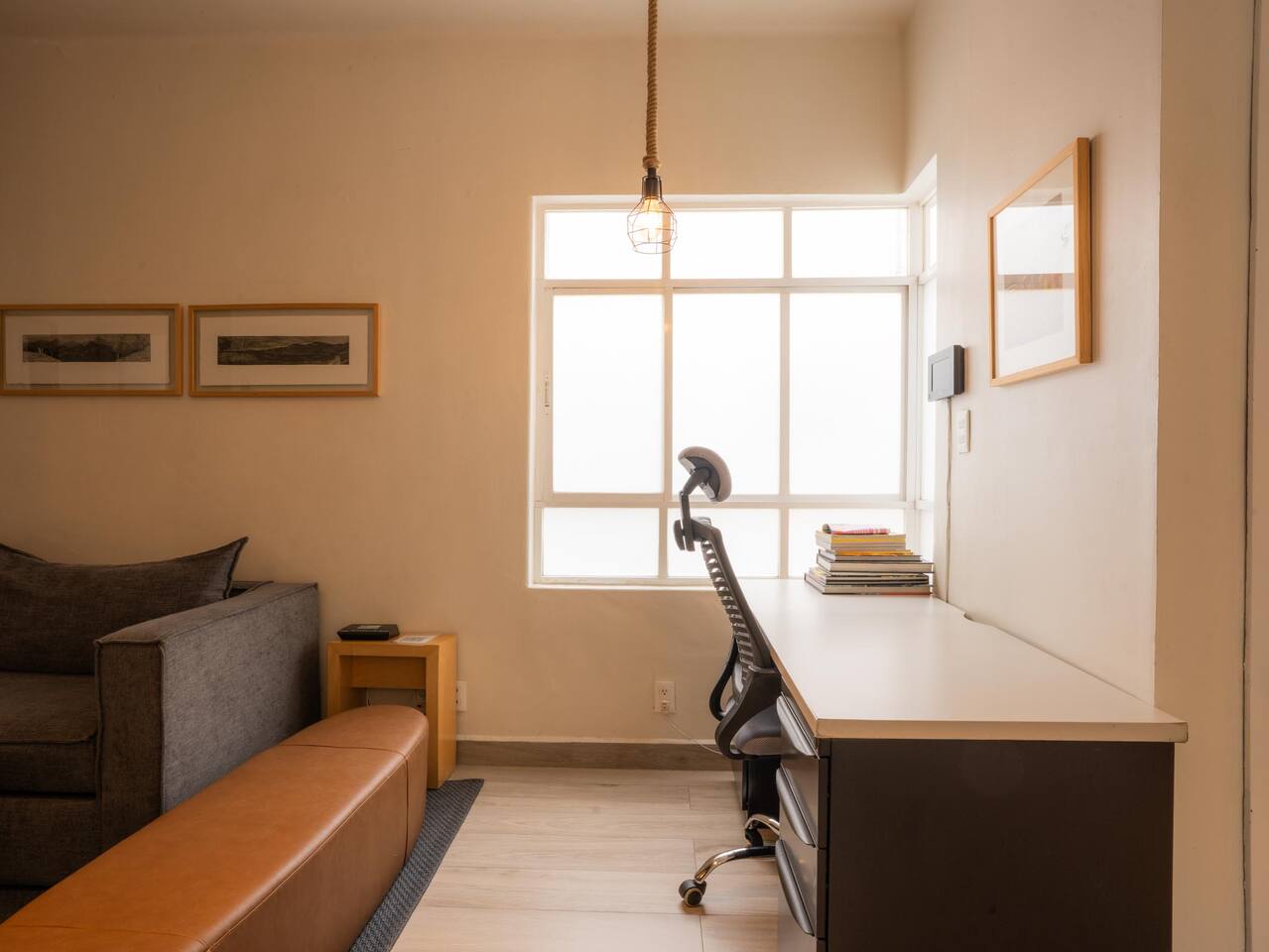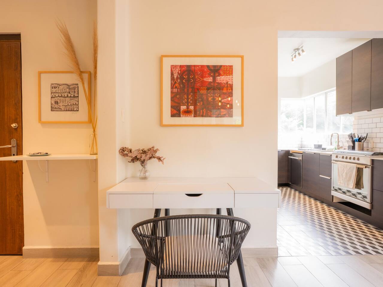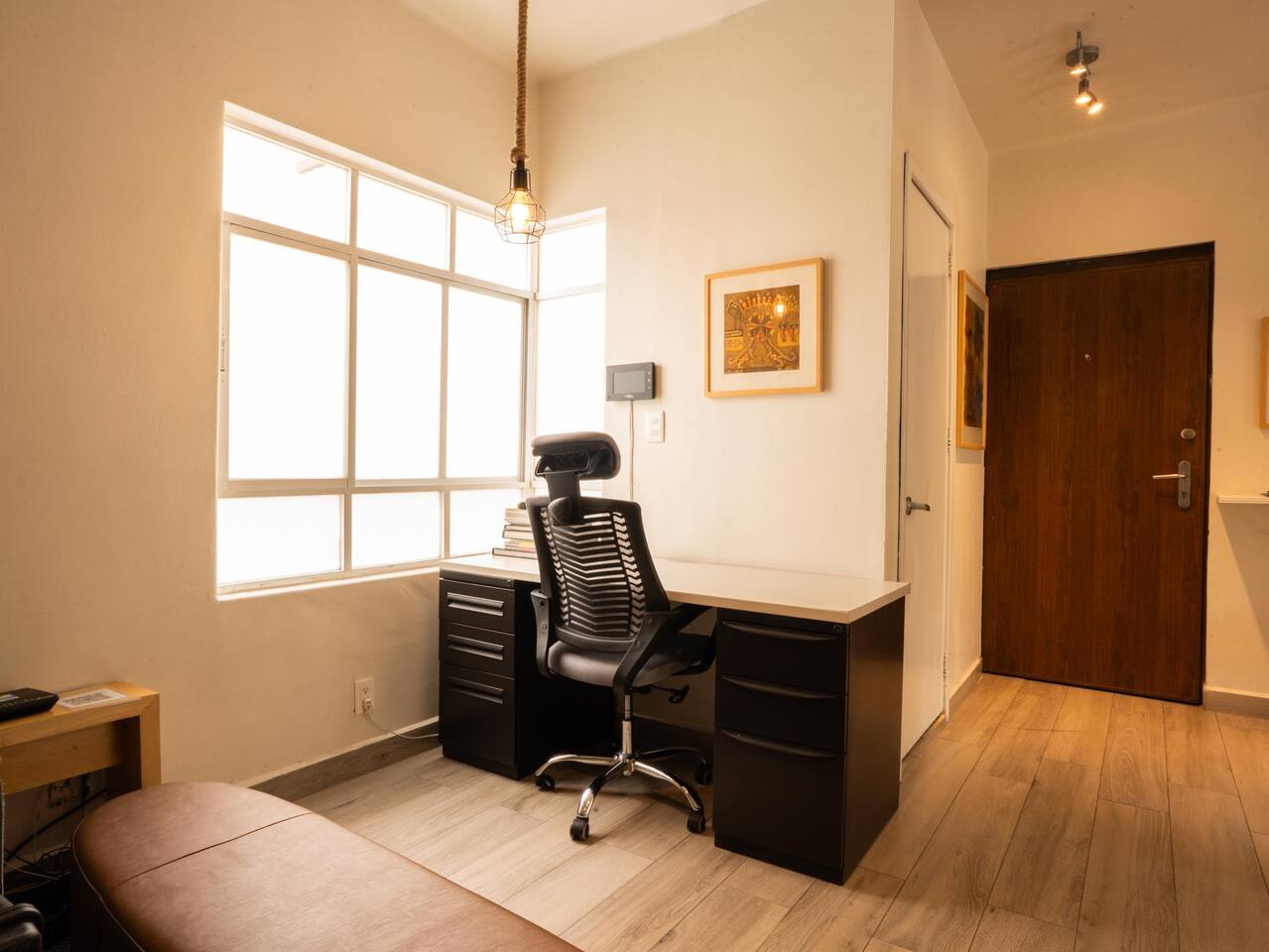 For those working remotely, the apartment offers two dedicated workstations—one of them set up with an ergonomic chair for extra comfort. Bright natural light fills the space, creating a welcoming atmosphere in one of Mexico City’s most sought-after neighborhoods.