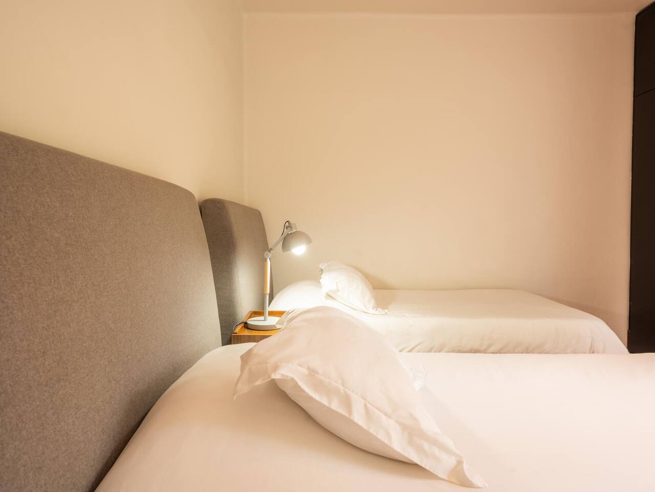 The apartment features 2 bedrooms and 1.5 bathrooms. The master bedroom has a king-size bed and a private en-suite bathroom. The second bedroom includes 2 twin beds, ideal for family or friends. Each bedroom is equipped with its own TV, as is the living room, ensuring entertainment for everyone.